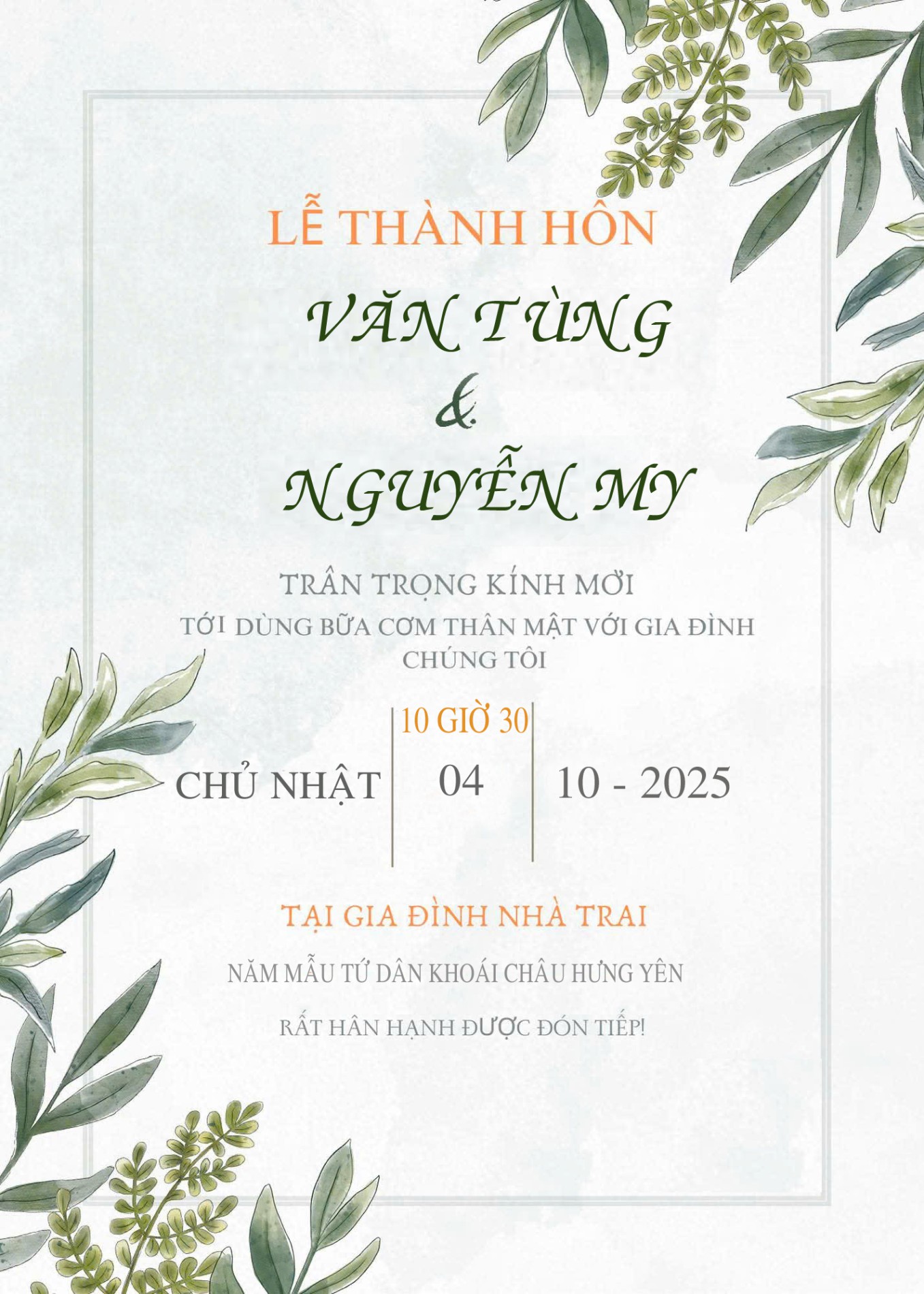 Gặp gỡ , yêu và cưới . Điều bạn vừa nghe không năm trong một câu chuyện cổ tích , mà chính là trong câu chuyện của cuộc đời hai chúng tôi. Chúng tôi sẽ yêu thương, chăm sóc , trân trọng và lắm tay nhau cùng đi đến hết cuộc đời này , thật là một niềm vinh hạnh lớn , khi ngày hạnh phúc nhất cuộc đời hai chúng tôi , có sự hiện diện và chúc phúc của bạn!